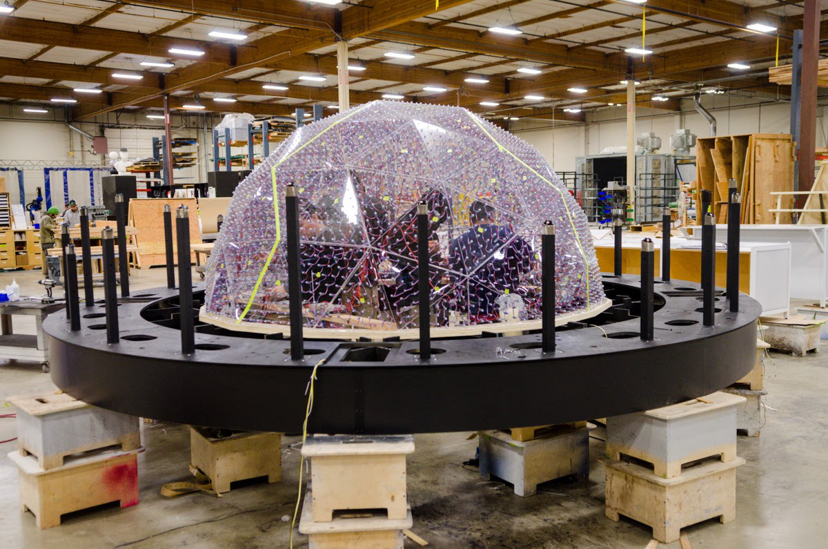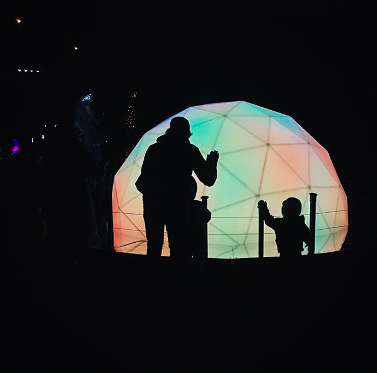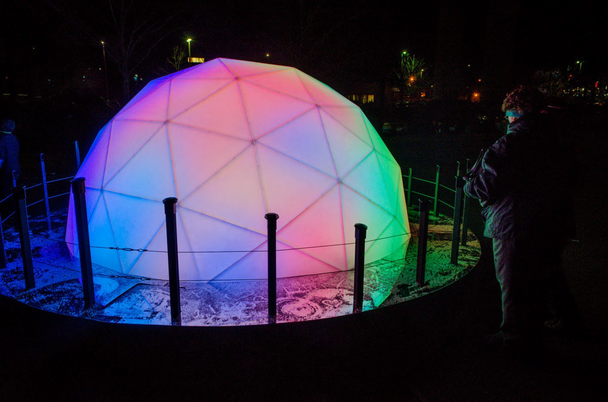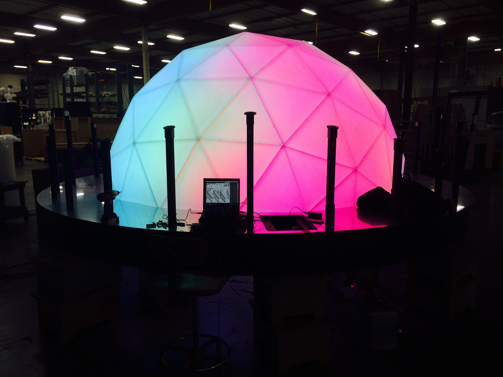 Build sponsor: Axiom Custom Products Co-Concept creator: Mikele Schnitman A Digital fire place, People change the atmosphere. 24 person interactive light and sound Geodome. PWLF 2017