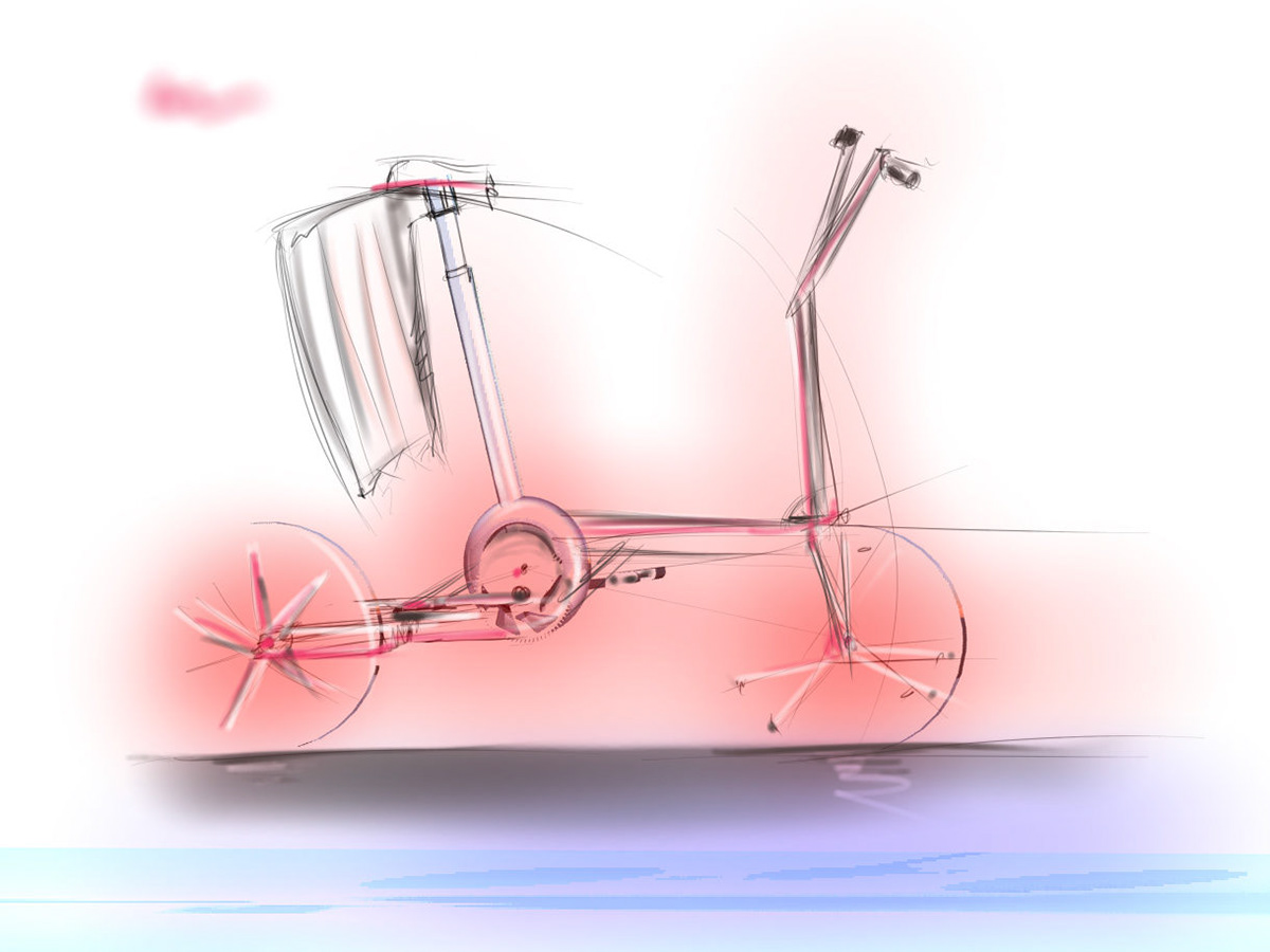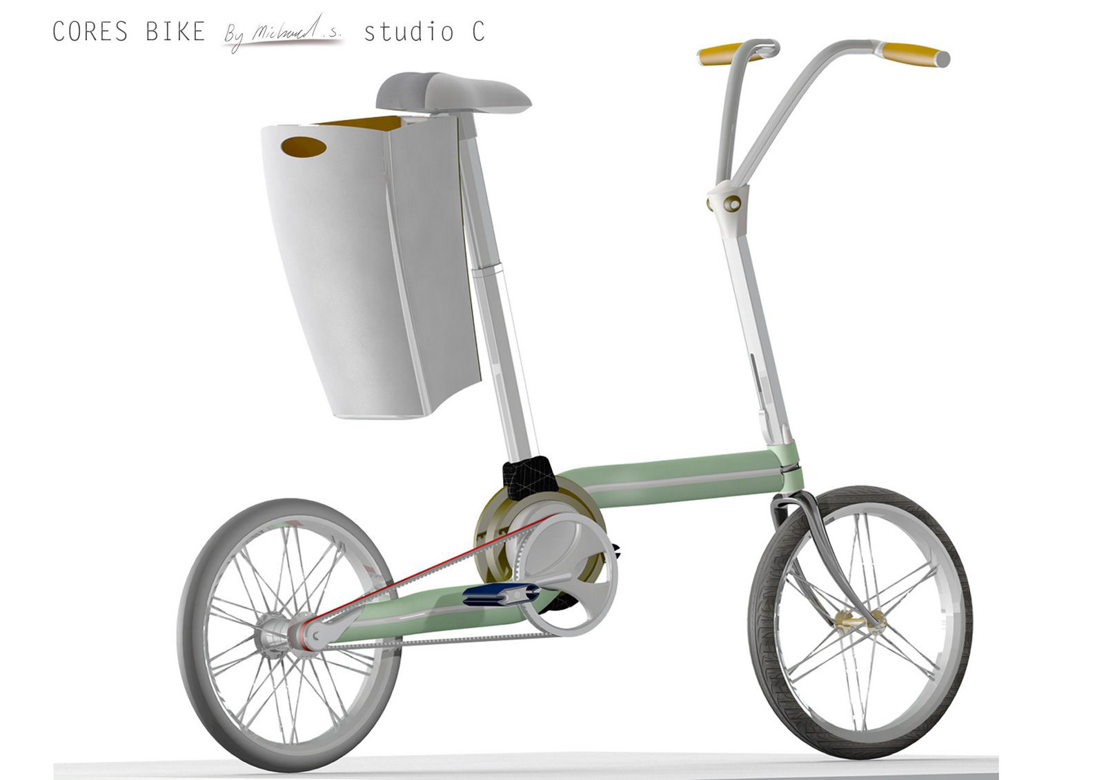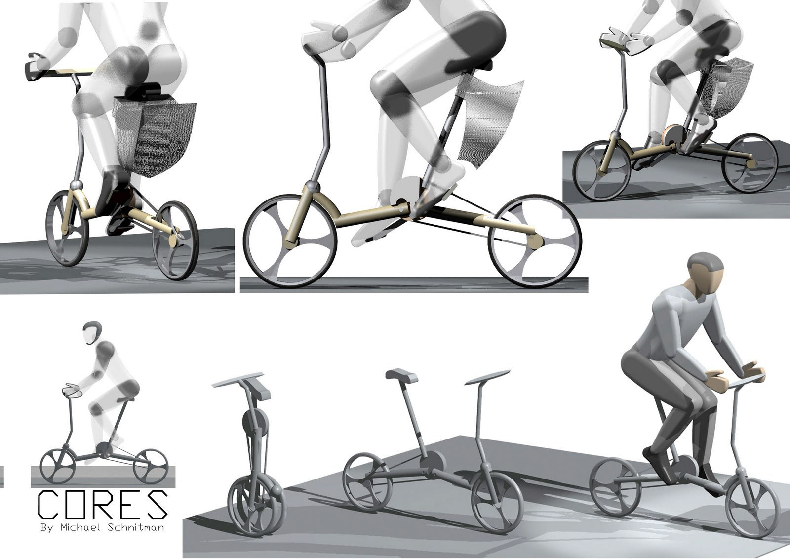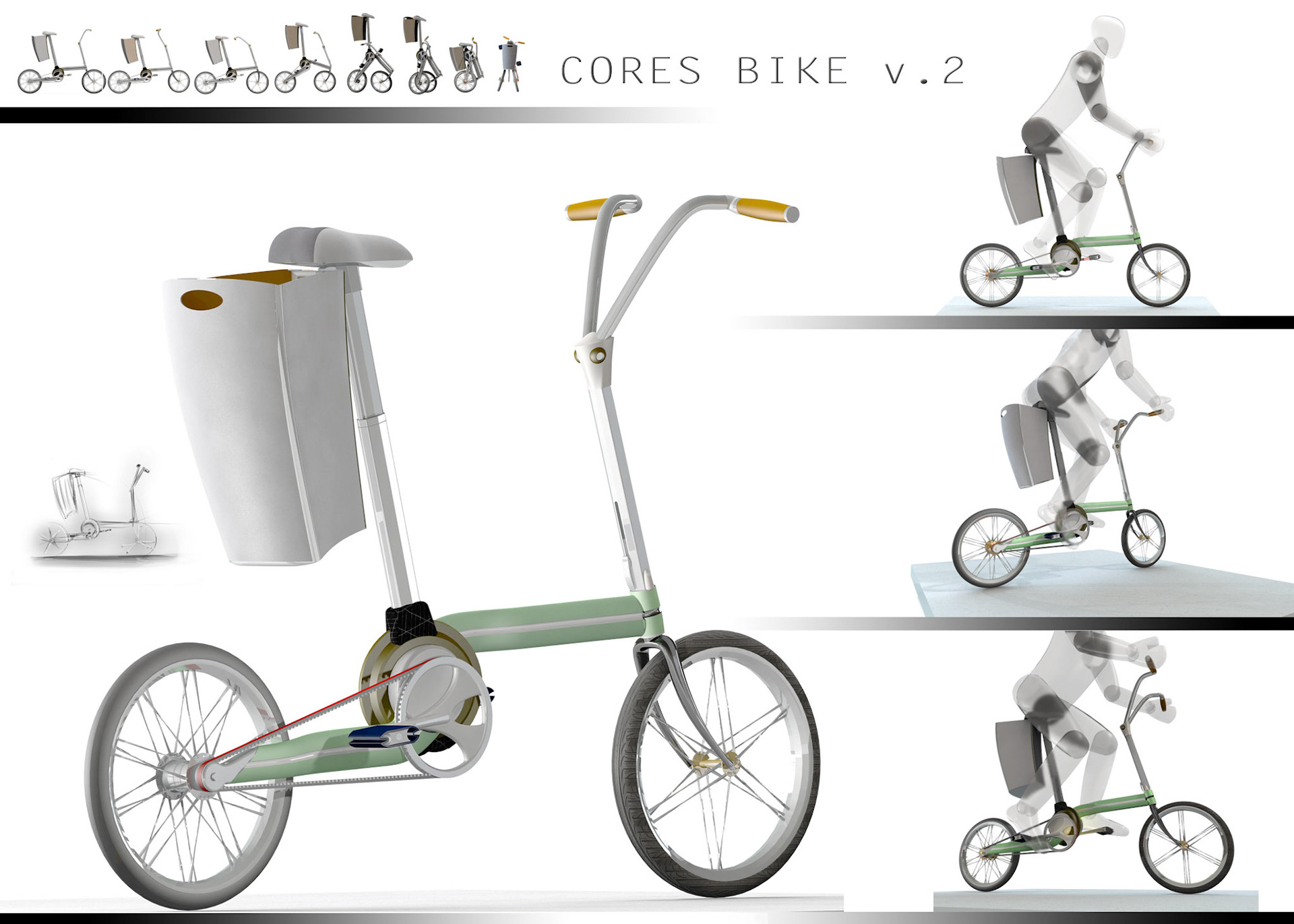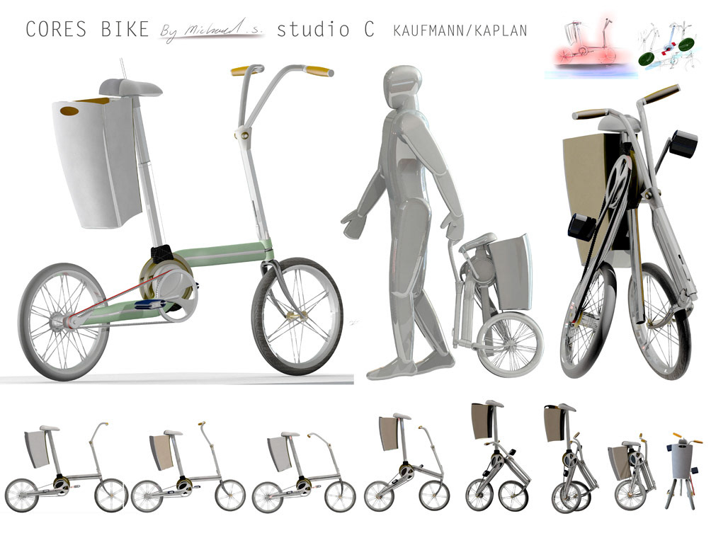 CORES = CORE = and Hebrew for 'collapse' A central circular hinge to fold the bicycle into a rolling Cart.